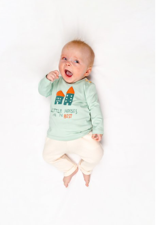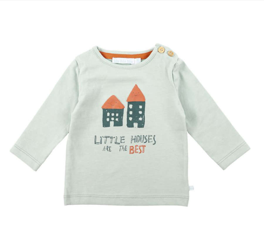 Een zacht en comfortabel T-shirt met lange mouwen, gemaakt van biologisch katoen. Voorzien van een vrolijke huisjesprint en de tekst “Little houses are the best”. Met schouderknoopjes voor gemakkelijk aan- en uittrekken.