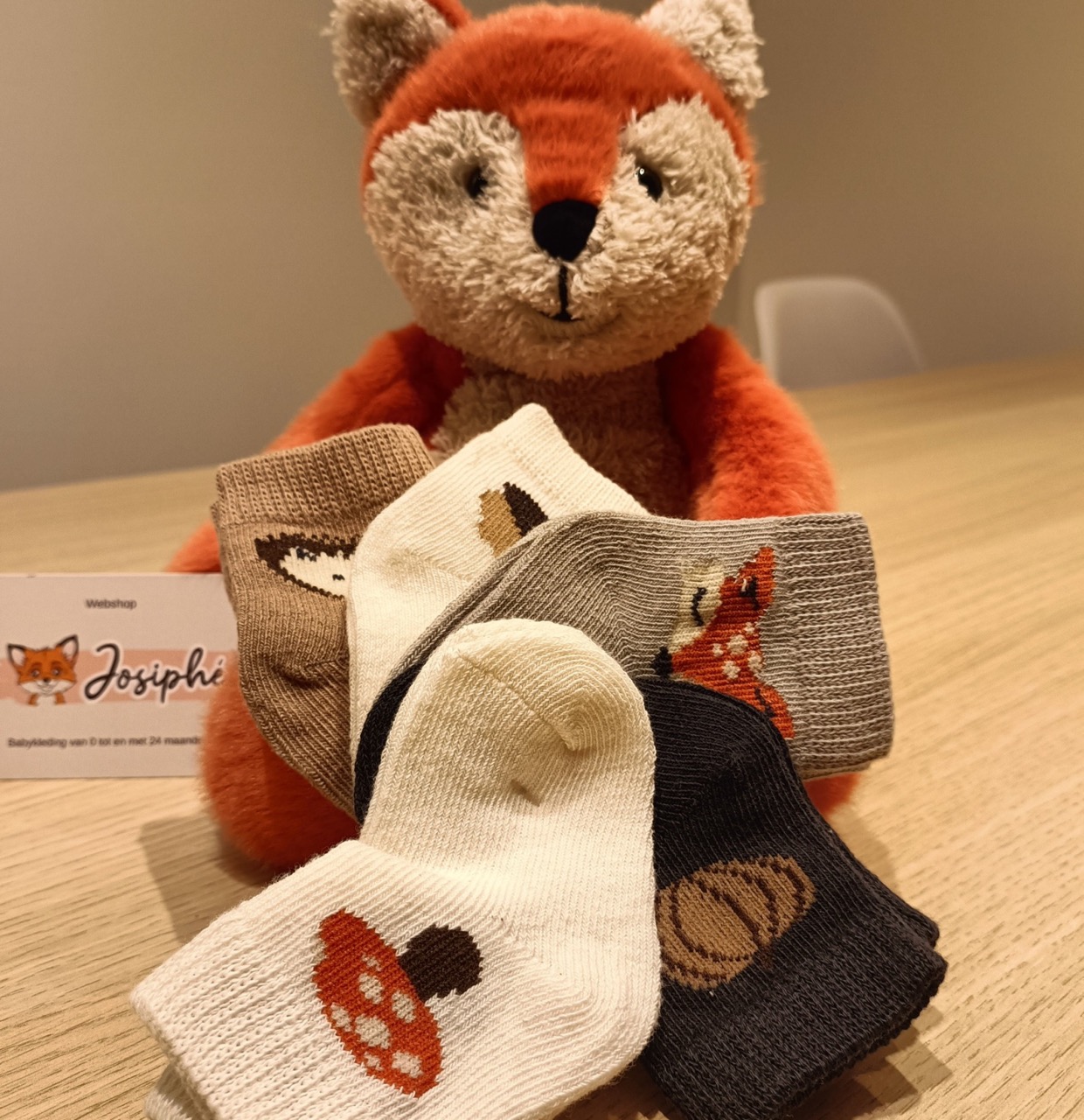 Schattige babysokjes met bosdieren en herfstmotieven zoals vosjes, paddenstoelen en eikels.