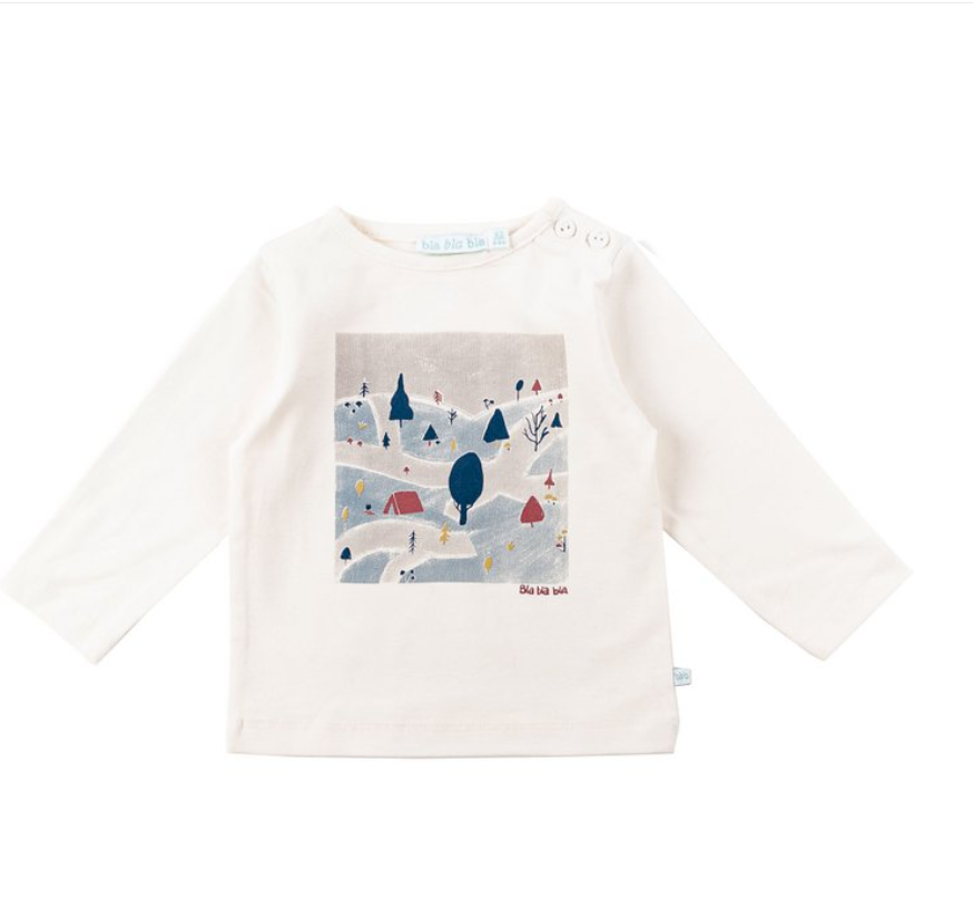 Een speels longsleeve T-shirt met boslandschap print. Gemaakt van biologisch katoen en voorzien van knoopjes op de schouder.