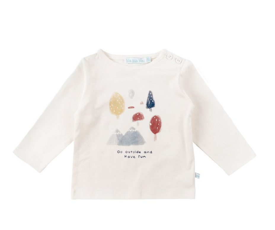 Een vrolijk longsleeve T-shirt met een kleurrijke natuurprint en de tekst “Go outside and have fun”. Gemaakt van zacht biologisch katoen.