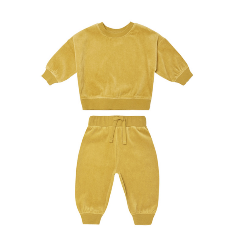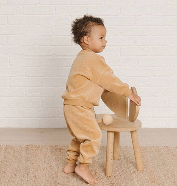 Een heerlijk zachte set van velours bestaande uit een trui en broekje in een warme camel kleur. Ideaal voor zowel speel- als loungetijd.