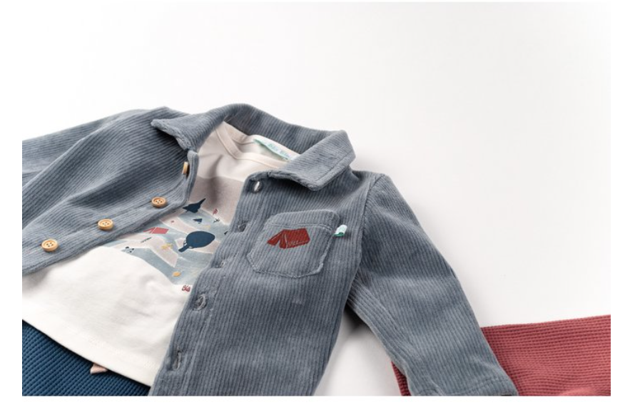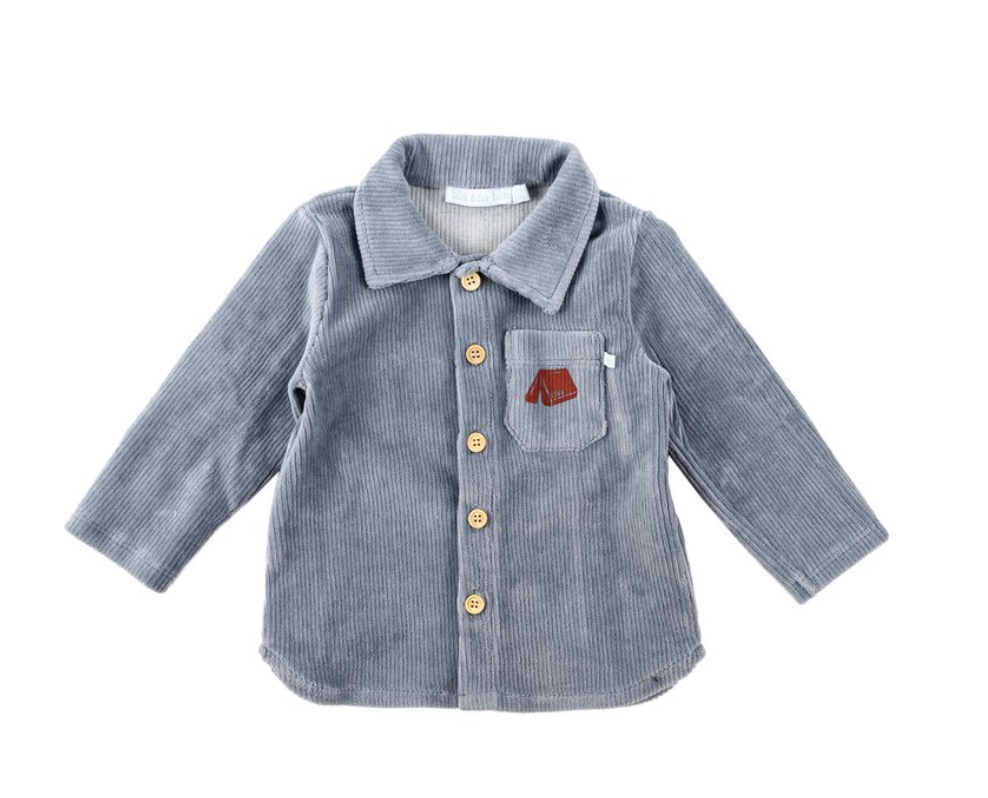 Een stoer en tijdloos hemdje van zachte ribvelours. Met houten knoopjes, een borstzakje en een subtiel geborduurd detail. Draagbaar als blouse of open als jasje.