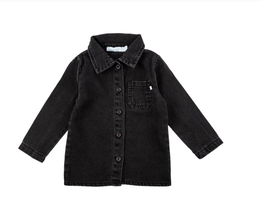 Een stoer denim hemdje in zwart. Met knoopsluiting, borstzakje en een comfortabele pasvorm. Kan ook open gedragen worden als jasje.